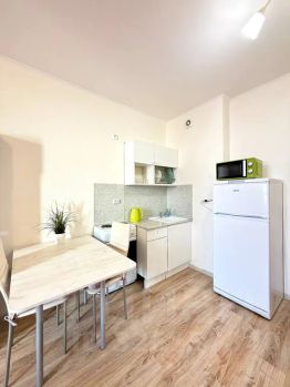 Кухня: холодильник, варочная панель, электрический чайник, а также весь необходимый комплект посуды и столовых приборов