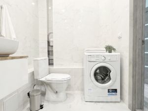 Стиральная машинка, гладильная доска, утюг, фен;