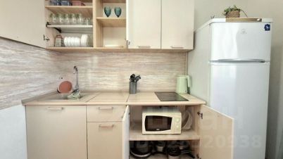 Полностью оборудованная кухня: плита, холодильник, микроволновка, посуда, кастрюли, сковорода.