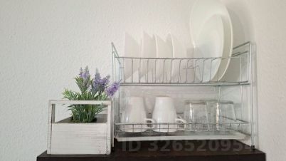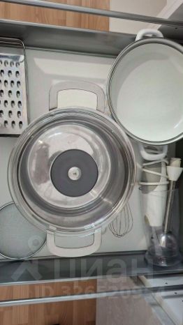 Кухня: холодильник, микроволновка, чайник, посуда, плитка.