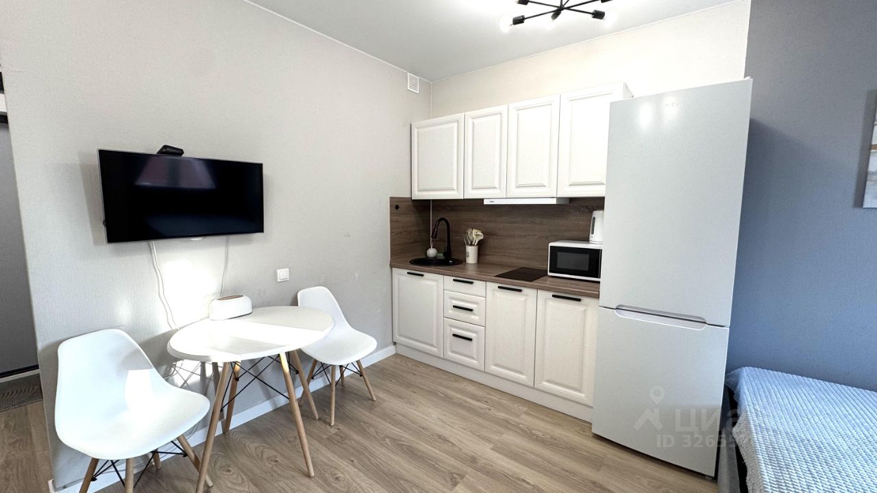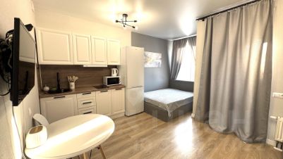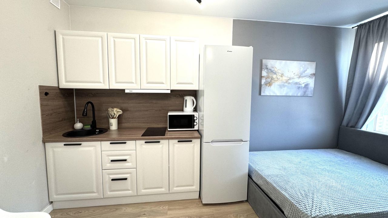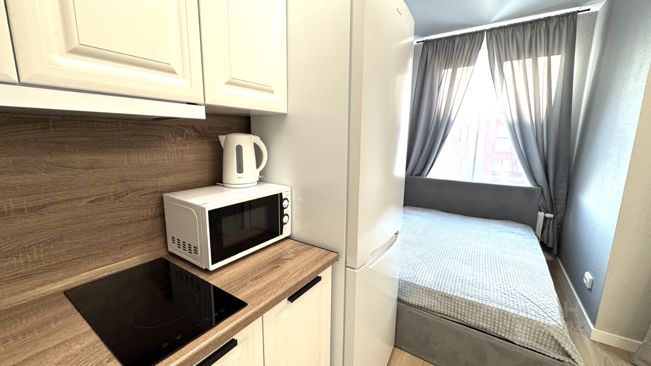Студия оборудована всем необходимым. Кухонный гарнитур со всеми удобствами. Кровать с ортопедическим матрасом, раскладной диван, 2 шкафа для одежды и комод. Техника, текстиль и посуда. Лоджия с прекрасным видом.