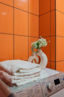Ванная комната: ванная, стиральная машина, полотенца, утюг, гладильная доска, сушилка, фен, гель для душа, шампунь, мыло, зубная паста.