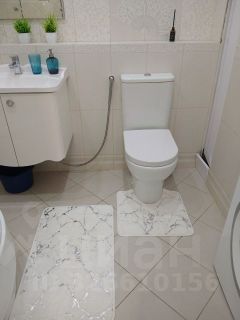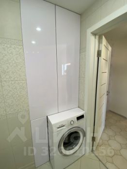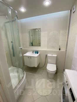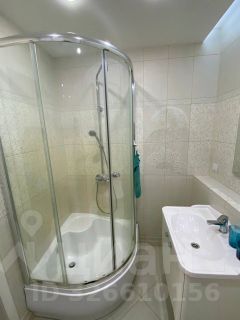 В ванной плитка, душевая кабина, шкафы для хранения.