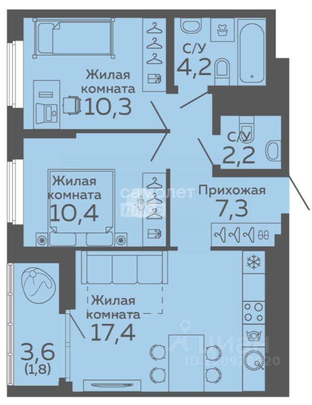 Арт. 129855493 Светлая и уютная евро 3-х комнатная квартира в перспективном районе