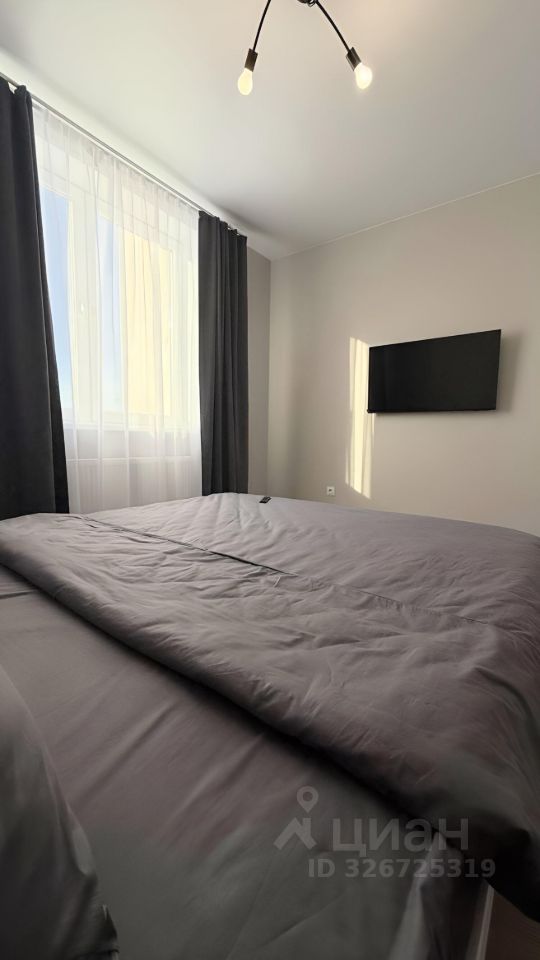 В спальне двуспальная кровать с ортопедическим матрасом и шторами блэкаут для комфортного и крепкого сна.