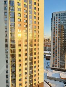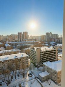 На 14-м этаже с потрясающим панорамным видом: много света, открытая перспектива на жилые кварталы и зелень (вид реально один из лучших в доме!).