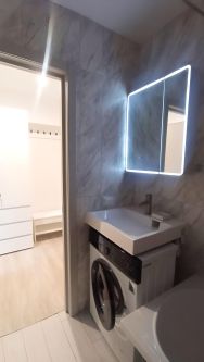Комфорт и технологии: В студии реализованы различные сценарии освещения — можно создавать уютную или рабочую атмосферу. Установлены умные выключатели, интегрированные с Алисой (умная колонка в комплекте). Управляйте светом голосом, не вставая с дивана. В санузле — ванна и теплый пол для дополнительного уюта.