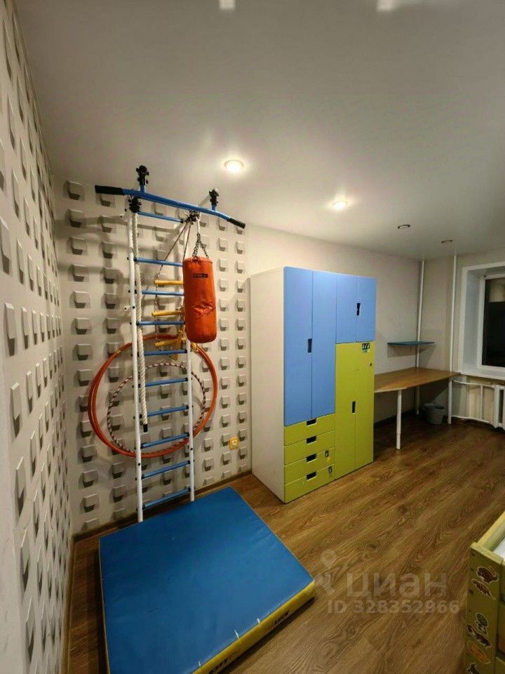 Детская комната: шведская стенка, спальные и рабочие места, плательный и книжный шкафы. Если нужна только одна кровать, вторую можно демонтировать.