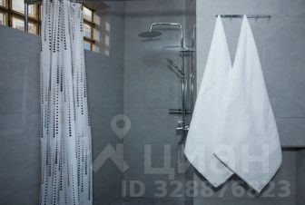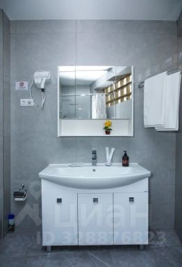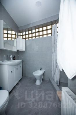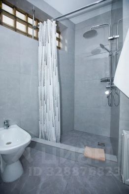Ванная комната с подогреваемым полом, в которой находятся: душевая, раковина, унитаз, биде, зеркало, фен, туалетные принадлежности.