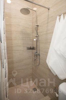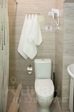 Ванная комната, в которой находятся: душевая, унитаз, раковина, зеркало, фен, туалетные принадлежности.