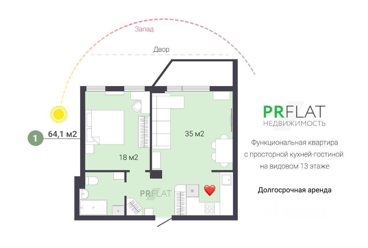 Окна выходят на запад. Расположена квартира на видовом 13 этаже - открывается вид на двор и район.