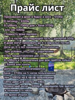 Стоимость с воскресенья по четверг 5500 руб, пятница 6500 руб, суббота 7000 руб. При заезде берем залог 5000 руб, возвращаем при выезде в течении часа во время уборки.