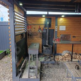 - Мангальная зона, закрытая от дождя и ветра (мангал 90х30см+ шампура+решетки, печь для казана диаметр 40см, электричество).