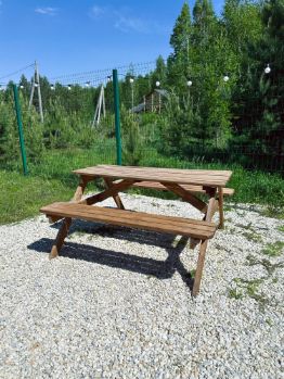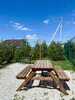 На улице - терраса, зона барбекю среди хвойных деревьев.