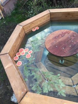 Кедровый чан стоит возле вековой ели, температура воды по вашему желанию.