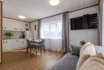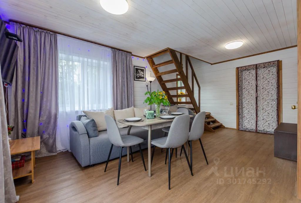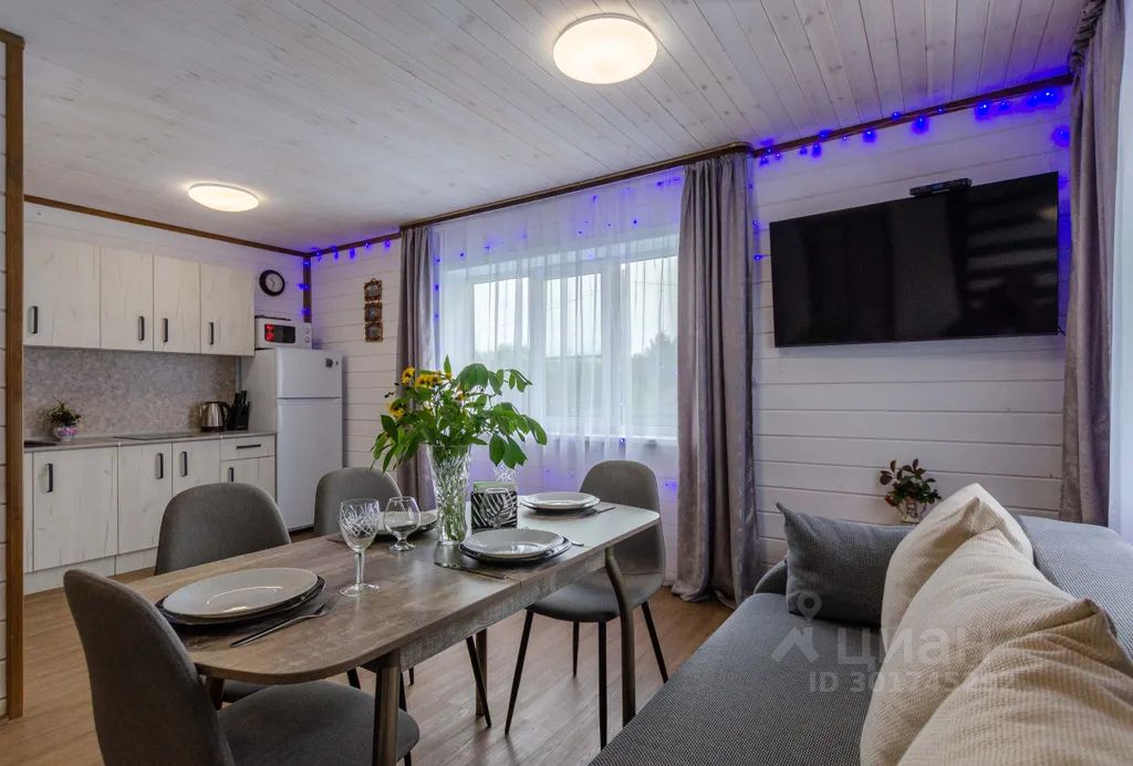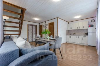 1 этаж - кухня-гостиная 25 кв. м, кухонный гарнитур, холодильник, стол и стулья, диван- кровать и кресло-кровать, благоустроенный санузел и бойлерная.