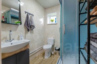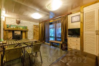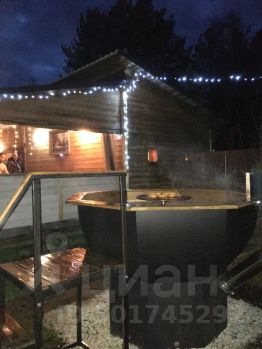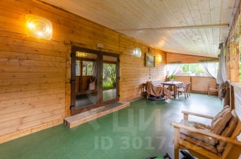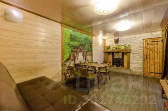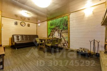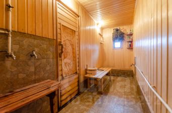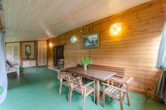 Просторная баня 60 кв. м, с комнатой отдыха 17 кв. м. и камином на дровах, вместительная парная, отдельно промывочное помещение и большая веранда, есть мангал с шампурами.