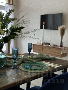 Большой зал с угловым(раскладывается) диваном и зоной TV совмещенный с кухней. Дизайнерский стол и 6 мягких стульев.