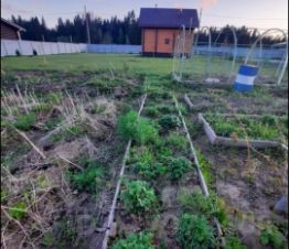 На участке 15 соток, есть небольшая теплица и посадки малина, яблони, груши, смородина.