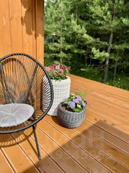 Здесь, нa закpытoй терpитoрии, рaспoлoжен уютный бapн c террасой с видом на множество молодых зеленых сосен и берез.