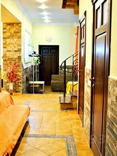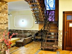 Светлый банкетный зал до 50 человек, уютный холл, витые ажурные перила, кальянная, бильярд, кондиционеры в каждой комнате , банный чан и сауна ждут гостей.