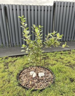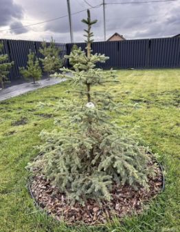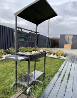 Растения с газоном, соснами и голубой елью, мангал с крышей.