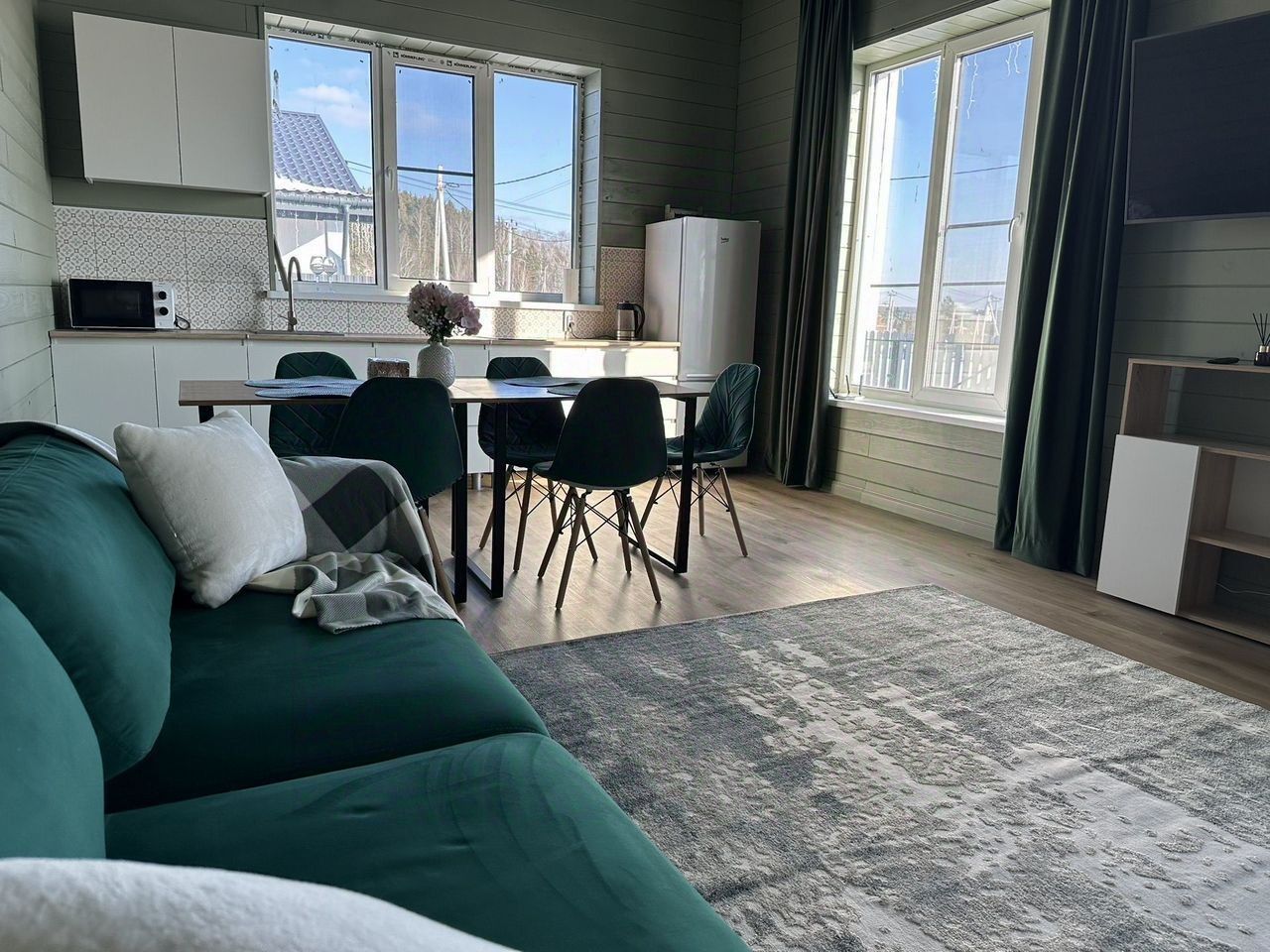 ПРОСТОРНАЯ ГОСТИНАЯ: Стол с 8ю стульями перед панорамным окном с видом на два дивана, телевизор с ТВ-каналами, Wi-fi, зеркало, тумбочки.
