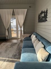 В доме три спальни 2 из них с двуспальной кроватью, одна с двумя односпальными, но при желании их можно соединить, и огромная гостиная с большим диваном на 4-х человек.