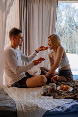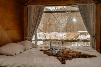 Большая двуспальная кровать, панорамные окна с видом на лес