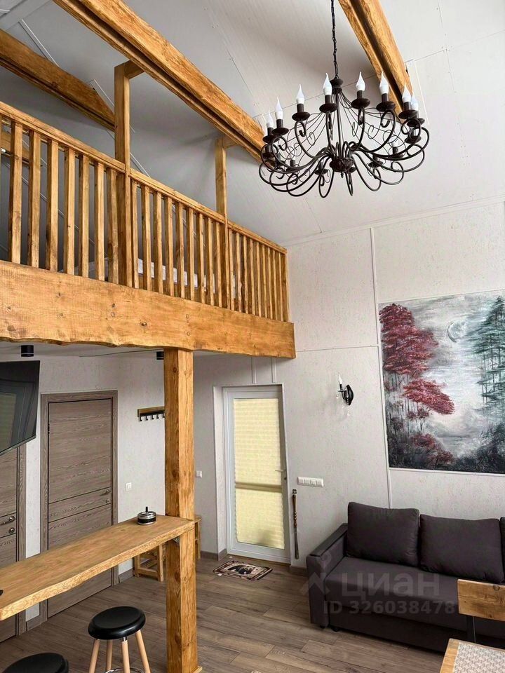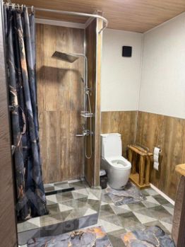 1-й этаж — просторная гостиная с большим диваном и обеденным столом, кухонный уголок, современный санузел с душевой.