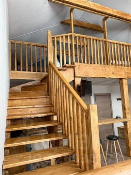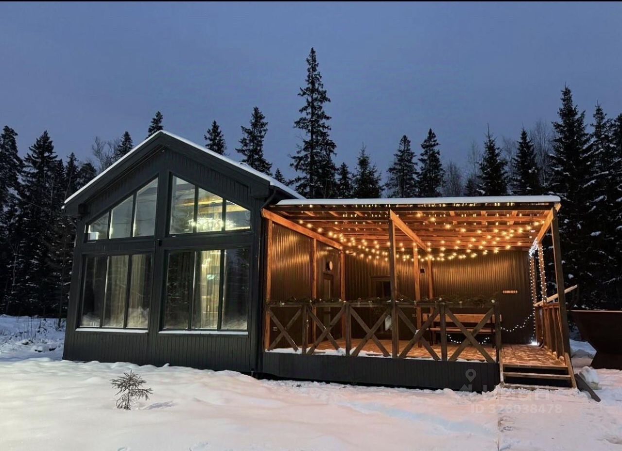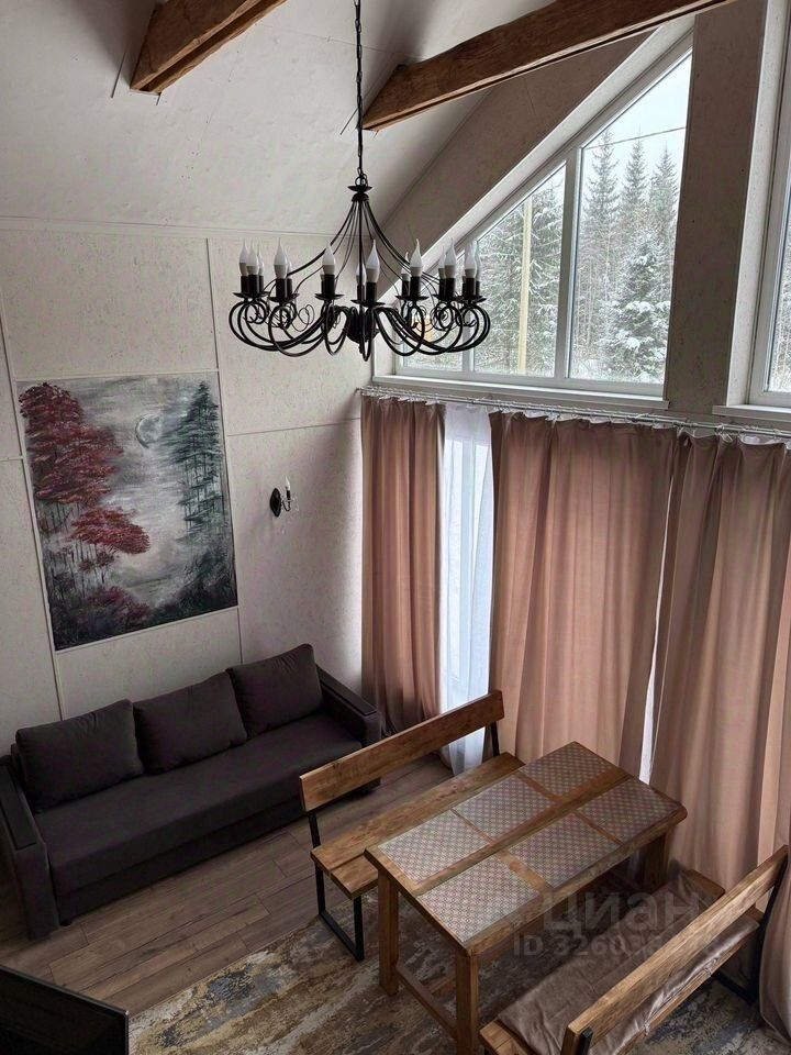 Медвежья берлога — это суровый уют северного леса: высокие потолки с деревянными балками, огромные панорамные окна от пола до потолка с видом на заснеженные сосны, тёплый свет люстр и картины с лесными мотивами. Сканди-интерьер из натурального дерева и камня, мягкая зона с диваном и лавками, текстиль в тёплых тонах — здесь хочется замереть, слушая тишину леса.
