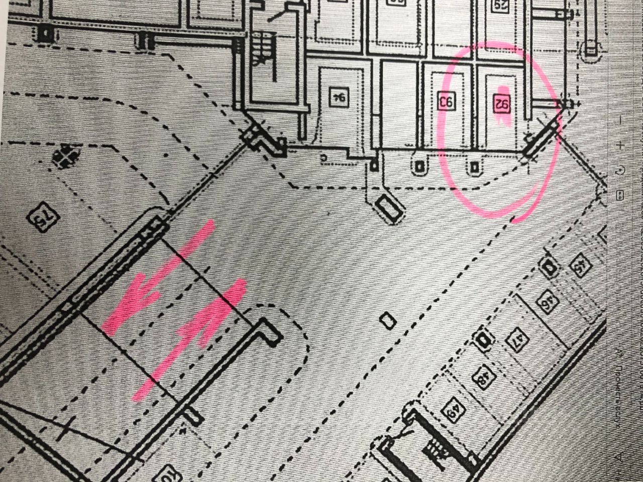 Парковочное место 92 огорожено с 3 сторон стенами, в соседнем боксе (92 на фото плана) установлены подъемные ворота
