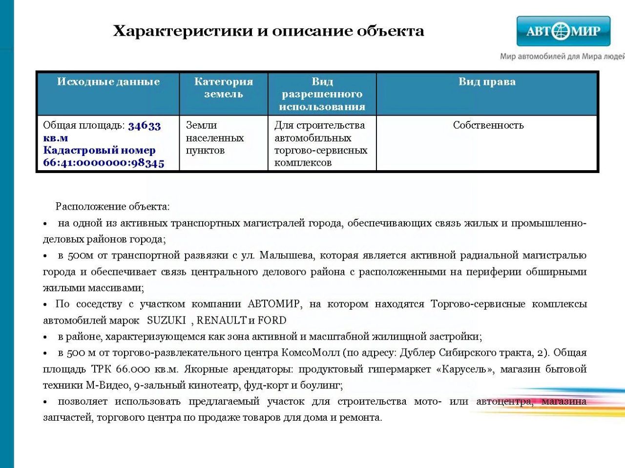 на одной из активных транспортных магистралей города являющейся частью Срединного кольца и в 500 м от транспортной развязки с ул. Малышева ( активной радиальной магистралью города). В 500 м торгово-развлекательный центр КомсоМолл.