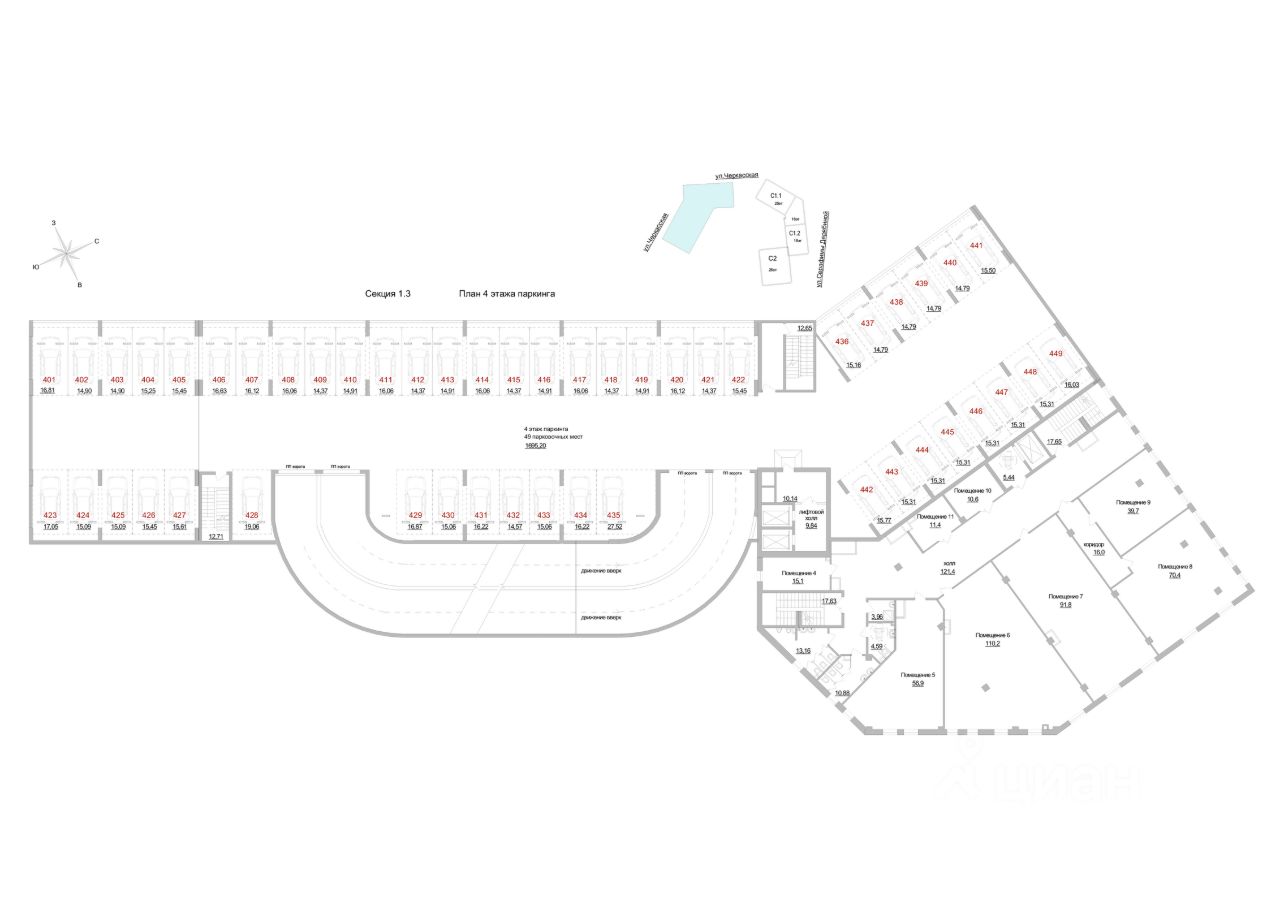 Коммерческие и офисные площади размещаются в секции 1.1 и на 3-х этажах делового центра (секция 1.3).