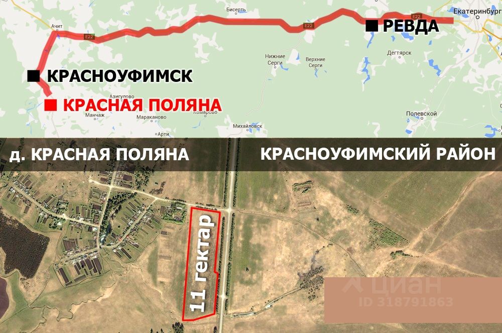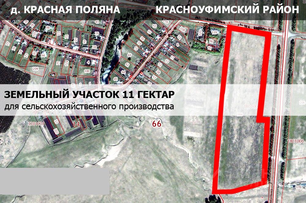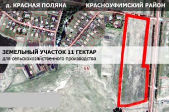 11 гектар земли в 190 км от Екатеринбурга, рядом д. Красная Поляна. Земля под с/хоз производство. Эл-во, вода вдоль участка. Подъезд асфальтированная дорога.