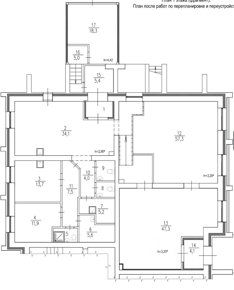 7 мокрых точек (3 санузла, уборочная, кухня, буфет, комната персонала)