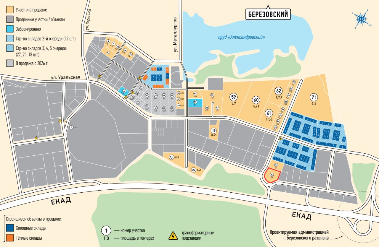 В наличии также участки другой площади, в том числе со складскими комплексами.