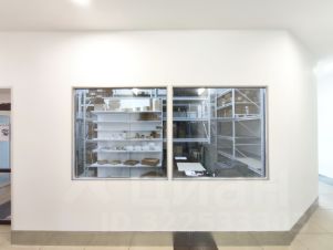Оснащён грузовыми стеллажами, торговым стеллажом, рабочим местом сотрудника и зоной для клиента.