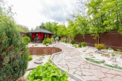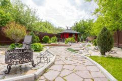 Территория с вечерней электро подсветкой, садовыми светильниками.