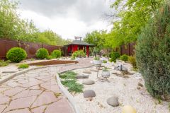 Беседка в японском стиле с мебелью из искусственного ротанга.
