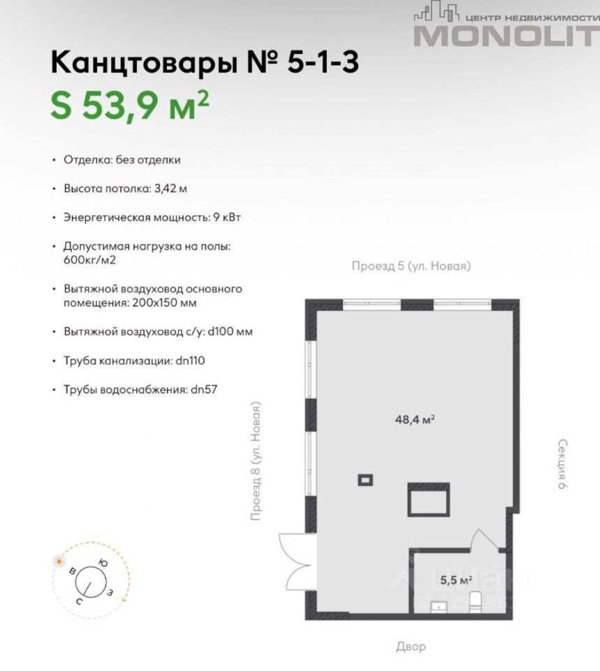 Общая площадь: 53.9 кв.м.
