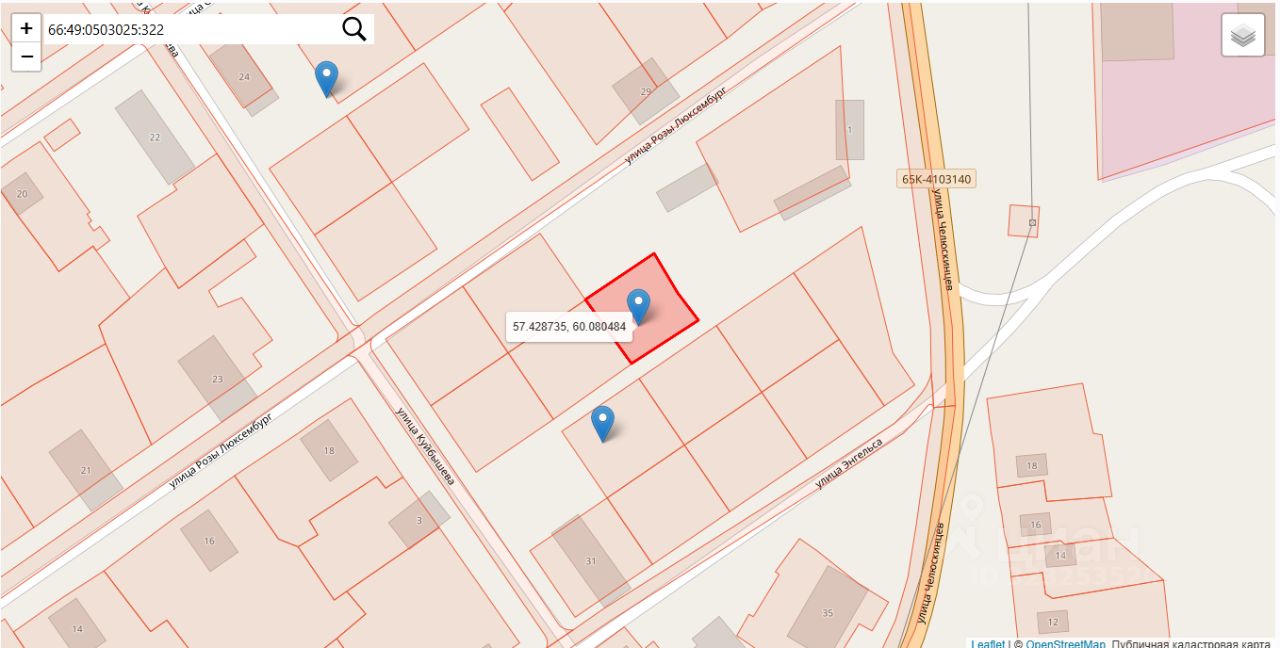 Земельный участок с кадастровым номером 66:49:0503025:322, общей площадью 747,0 квадратных метров, местоположение: Свердловская область, город Кировград, улица Розы Люксембург, участок 24А