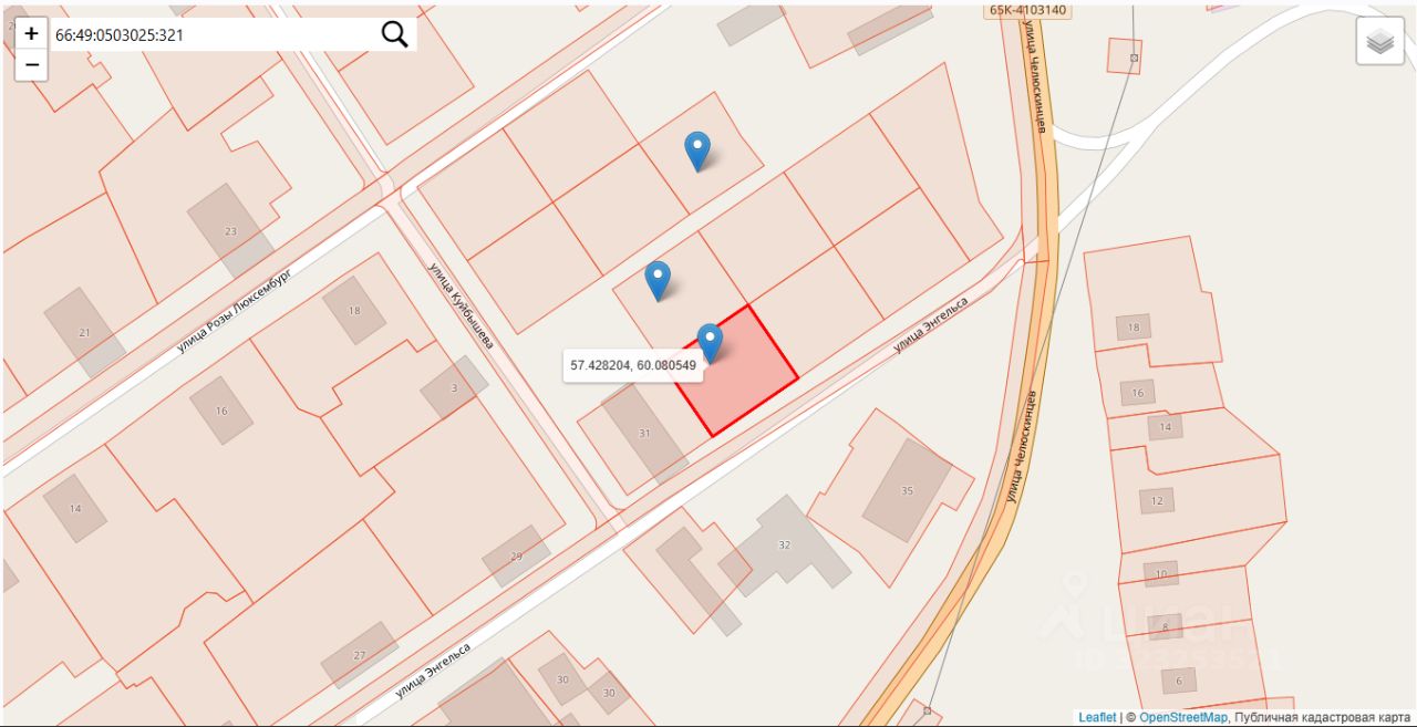 Земельный участок с кадастровым номером 66:49:0503025:321, общей площадью 880,0 квадратных метров, местоположение: Свердловская область, город Кировград, улица Энгельса, участок 31