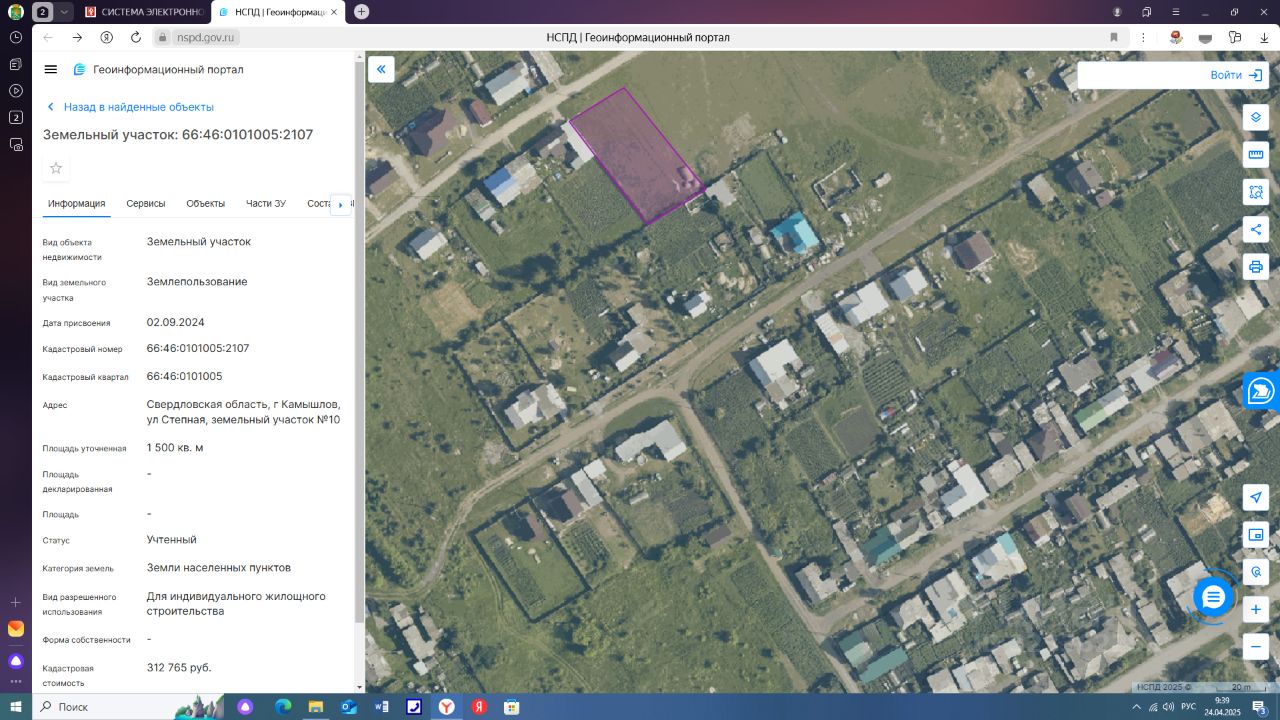 Земельный участок с кадастровым номером 66:46:0101005:2107; Адрес земельного участка: Свердловская область, город Камышлов, улица Степная, земельный участок 10; Площадь земельного участка: 1500,0 кв. м.; Категория земель: земли населенных пунктов; Вид разрешенного использования: для индивидуального жилищного строительства; Земельный участок относится к землям, право государственной собственности на которые не разграничено