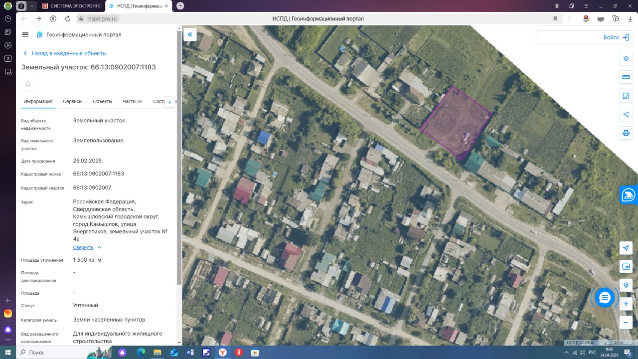 Земельный участок с кадастровым номером земельного участка: 66:13:0902007:1183; Адрес земельного участка: Российская Федерация, Свердловская область, Камышловский городской округ, город Камышлов, улица Энергетиков, земельный участок 4а; Площадь земельного участка: 1500,0 кв. м.; Категория земель: земли населенных пунктов; Вид разрешенного использования: для индивидуального жилищного строительства; Земельный участок относится к землям, право государственной собственности на которые не разграничено