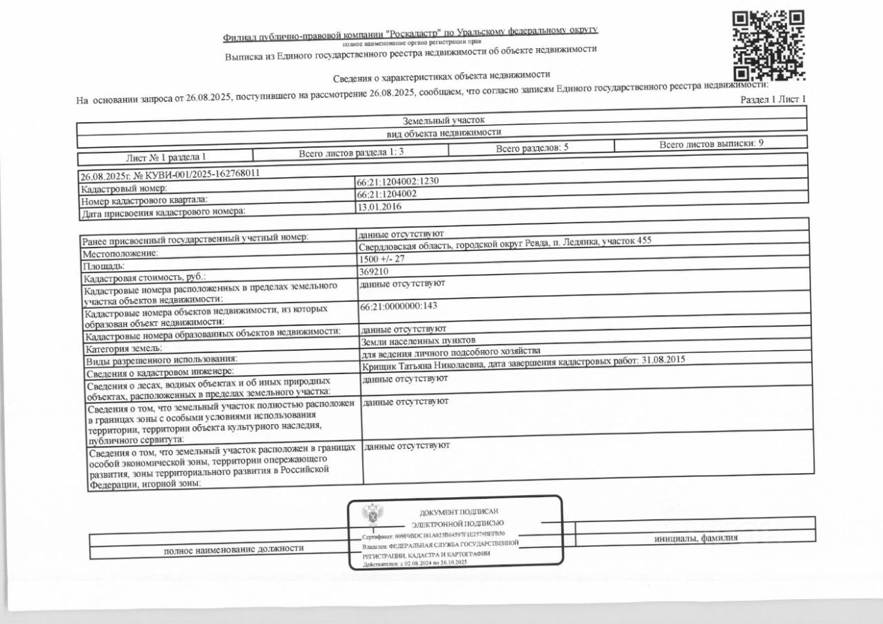 Должник: Гаджиев З.М., собственник: Гаджиев З.М. Лот: Земельный участок (земли населенных пунктов, для ведения личного подсобного хозяйства), площадь 1500 кв.м., кадастровый номер: 66:21:1204002:1230, городской округ Ревда, п. Ледянка, уч. 455, н/ц: 211200 р, з-к: 211 р, код: 0014, рег. 47-2291/25;