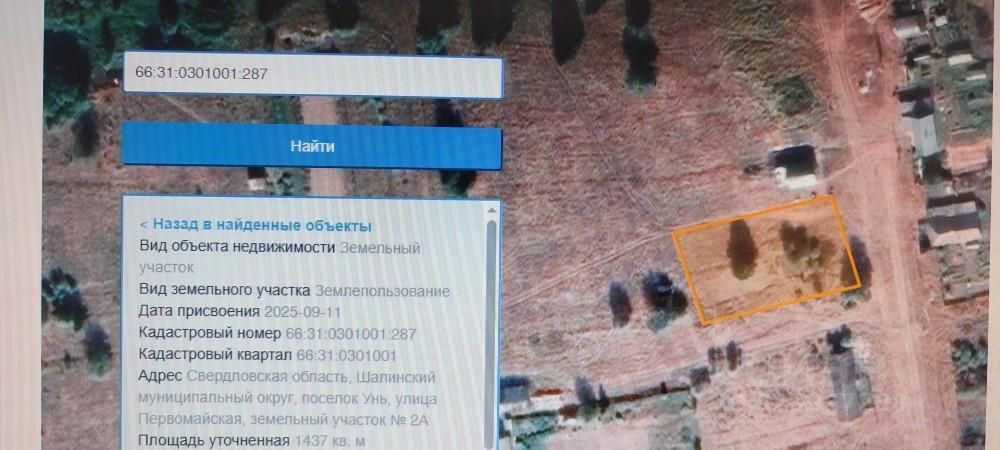 Лот 5 земельный участок с разрешенным использованием: для индивидуального жилищного строительства, с кадастровым номером 66:31:0301001:287, общей площадью 1437,00 кв.м., адрес: Свердловская область, Шалинский муниципальный округ, поселок Унь, улица Первомайская, земельный участок 2А.