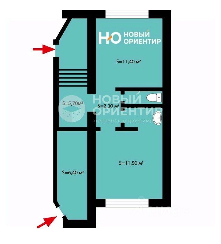 Основное помещение на уровне первого этажа дома. В помещении две изолированные комнаты площадью 11,4 и 13,4 кв м, раздельный санузел. Окна выходят на разные стороны.