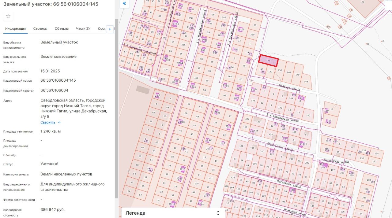 Лот 3. Земельный участок для индивидуального жилищного строительства. Категория земель земли населенных пунктов. Кадастровый номер 66:56:0106004:145. Местоположение: Свердловская область, городской округ город Нижний Тагил, город Нижний Тагил, улица Декабрьская, з/у 8. Площадь земельного участка 1240 кв. метров. Разрешенное использование земельного участка для индивидуального жилищного строительства. Начальная цена (рыночная стоимость земельного участка) 1 202 000 (один миллион двести две тысячи) рублей. "Шаг аукциона" 60 000 (шестьдесят тысяч) рублей. Размер задатка 240 400 (двести сорок тысяч четыреста) рублей