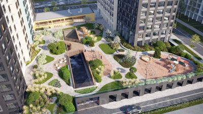 В первой очереди - высотная башня-32 этажа и малоэтажный дом-9 этажей. Внутри - уютное лобби с мягкой зоной, зона рецепции, выход в закрытый двор. С внешней стороны - бытовые сервисы, кафе и магазины "у дома".